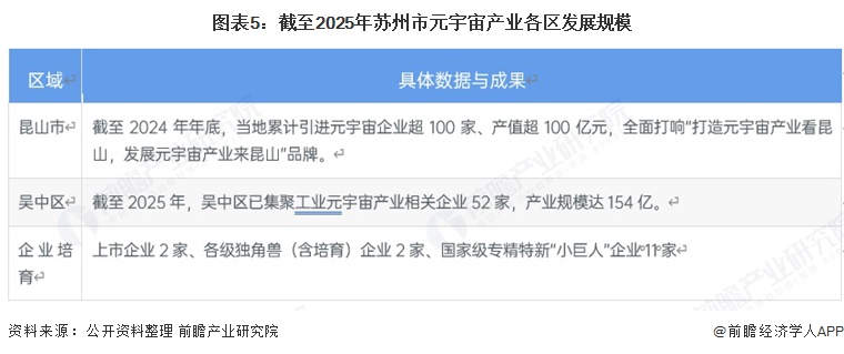 截至2025年,苏州市元宇宙产业呈现区域协同发展态势:昆山市作为产业集聚高地,已引进相关企业超100家、产值突破100亿元;吴中区则深耕工业垂直领域,集聚52家核心企业并形成154亿元产业规模,共同构建了分工明晰的元宇宙产业生态。