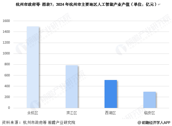 杭州市人工智能产业发展较好的地区主要为余杭区、滨江区和西湖区。例如,余杭区以“12个区级智能体”为核心载体,落地更多“AI+”实用场景,2024年产业产值达1500亿元,相关企业数量超过500家。滨江区全区已引进培育人工智能企业超过150家,在全市占比近30%。目前,全区基本形成 AIGC全产业链矩阵梯队。
