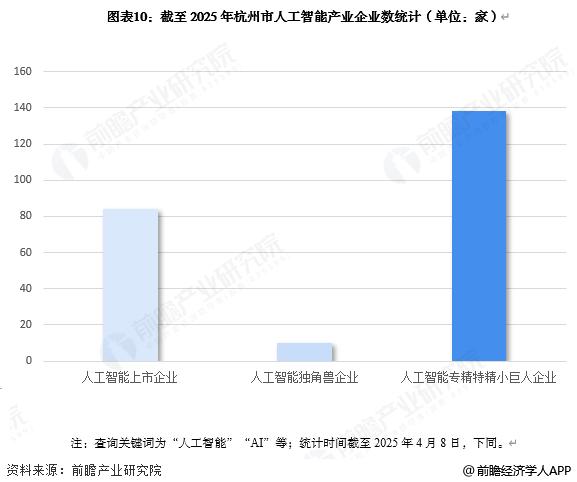 截至2025年11月,杭州市已汇聚人工智能上市企业84家,独角兽企业10家,专精特精小巨人企业138家。杭州市人工智能产业竞争力十分强劲。