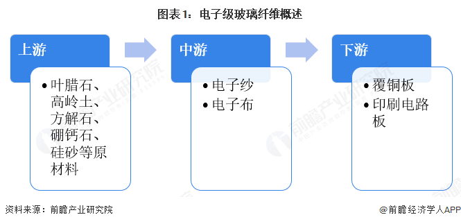 电子级玻璃纤维上游为叶腊石等原材料,中游包括电子纱、电子布等产品,下游主要包括覆铜板、印刷电路板等产品。