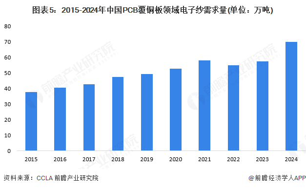覆铜板制造规模的增长,也带来了电子纱需求的增长。根据中国电子材料行业协会覆铜板材料分会的测算,2024年我国覆铜板行业电子玻纤布总计需求量约为35亿米,按照0.2 kg/m的电子纱需求量测算,2024年中国覆铜板领域玻璃纤维电子纱需求量约为70万吨。