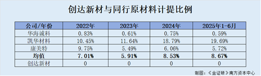 而按同行对原材料计提跌价准备的比例平均值测算,2022-2024年及2025年1-6月,创达新材或需对原材料计提的跌价准备金额约分别为197万元、192.47万元、272.17万元、273.76万元,合计达935.4万元。