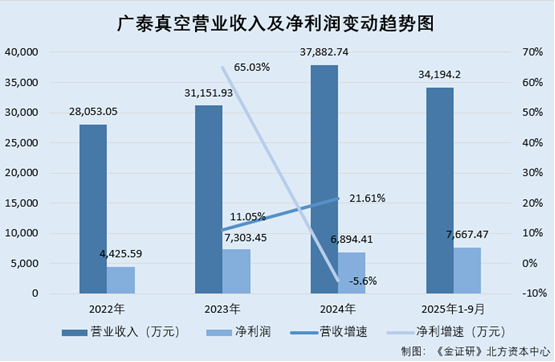 据广泰真空签署于2025年12月16日的招股说明书(以下简称“签署于2025年12月16日的招股书”),2022-2024年及2025年1-9月,广泰真空的营业收入分别为2.81亿元、3.12亿元、3.79亿元、3.42亿元,净利润分别为4,425.59万元、7,303.45万元、6,894.41万元、7,667.47万元。
