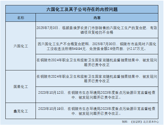 也就是说,2024年,六国化工曾因生产不合格产品被处罚,而2025年7月的抽检中,六国化工生产的复合肥的有效磷项目存在复检仍不合格的情形。需要指出的是,2024年,六国化工及控股子公司国星化工在卫生抽查中均被发现问题。且回溯历史,国星化工及六国化工另一家控股子公司鑫克化工在2023年度重点污染源日常监督检查中,均被发现问题已责令改正。
