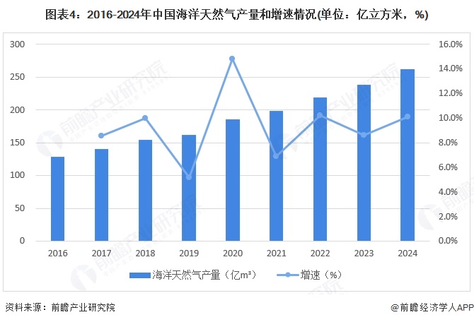 2016-2024年中国海洋天然气产量从129亿m³增长到262亿m³,年复合增速达9.3%。十四五”以来,中国海油天然气探井工作量大幅增加,海上天然气探井数和投资相较“十三五”同期翻番,实现了莺歌海低渗、超深水超浅层、深煤层、渤海高气油比潜山等重大领域突破,储量呈现爆发式增长。