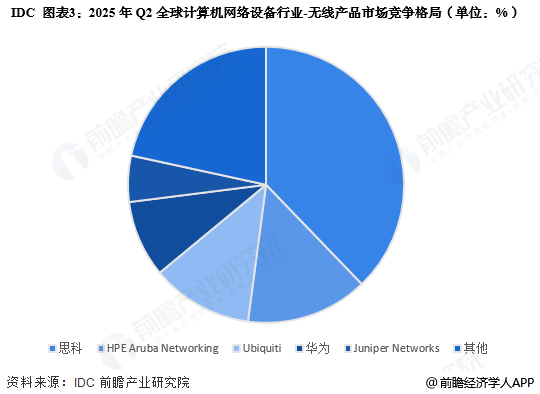 从目前发展情况来看,全球WLAN设备市场中,思科处绝对优势地位。据IDC统计数据显示,2025年第二季度,全球无线设备市场中思科亿37.8%的市场份额稳居第一,其余企业竞争较为分散。