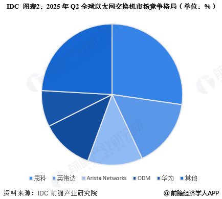 受益数据中心快速发展,交换机市场近几年迎来增长机遇。全球交换机市场领先企业包括思科、华为、Arista、ODM、华为。根据IDC数据显示,2025年第二季度,以太网交换机思科市场份额占比为27.3%,其次为英伟达,市场占比约15.7%,华为市场份额占比8.3%。