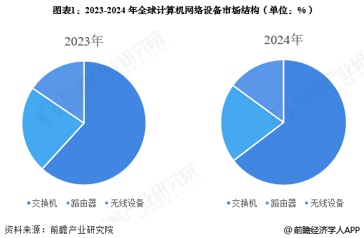 目前,计算机网络设备市场主要由交换机、路由器以及WLAN无线产品构成,其中交换机市场规模排第一,路由器次之,无线产品位列第三。据IDC统计数据显示,2024年交换机产品市场规模占比为65%;路由器市场占比为20%;无线设备市场占比为15%。