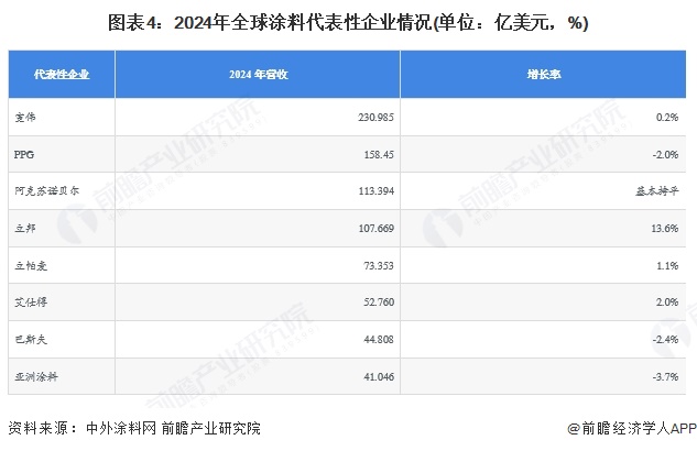 全球涂料代表性厂商包括宣伟、PPG、阿克苏诺贝尔、立邦、立帕麦、艾仕得、巴斯夫、亚洲涂料、关西涂料、百色熊等,其中宣伟、PPG、阿克苏诺贝尔2024年营收分别为230.985亿美元、158.45亿美元、113.394亿美元,位居全球前三。