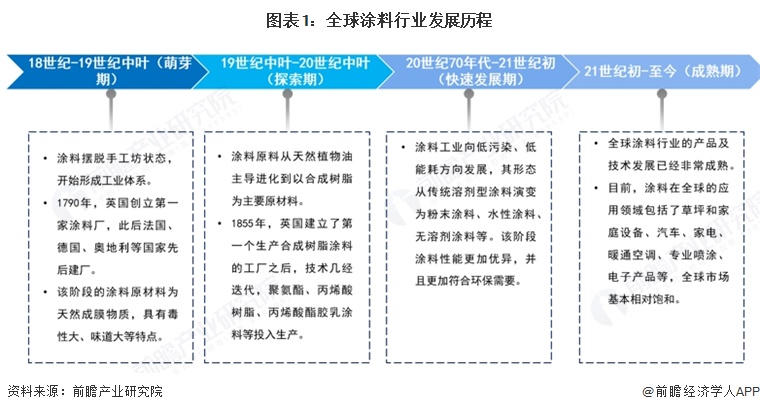 全球涂料行业萌芽于18世纪,涂料摆脱手工作坊状态,开始形成工业体系。1790年英国创立第一家涂料厂,该阶段的涂料原材料为天然成膜物质,具有毒性大、味道大等特点。步入19世纪中叶,涂料行业逐步进化到以合成树脂为主要原材料,1855年英国建立了第一个生产合成树脂涂料的工厂。