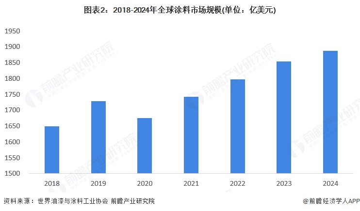 2018-2024年全球油漆涂料市场规模波动上升。根据世界油漆与涂料工业协会数据,2024年全球油漆涂料市场销售额为1888亿美元,较2023年同比上升1.8%。
