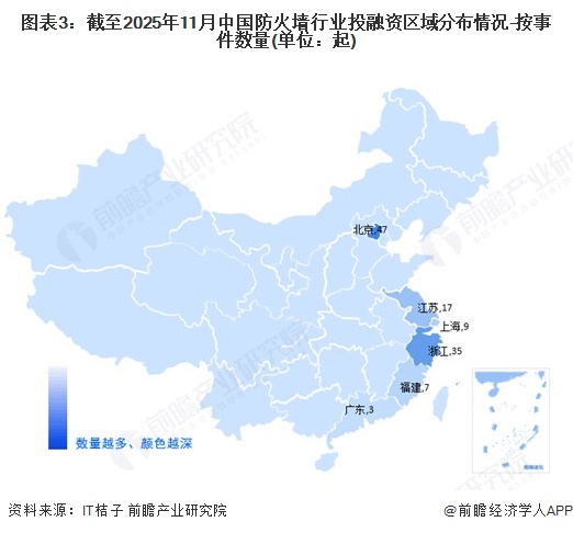 从防火墙行业的企业融资区域来看,目前北京和浙江的融资企业最多,截至2025年11月投融资数量分别累计达到47起、35起;其次为江苏和上海地区,投融资事件分别为17起、9起。