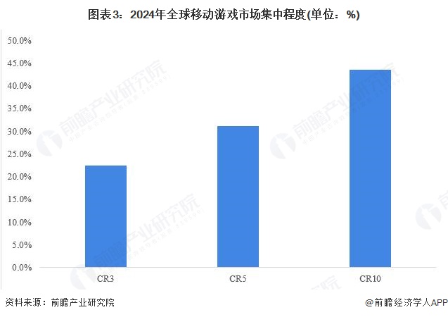 2024年全球移动游戏市场呈现高度集中格局,CR3、CR5、CR10分别达22.4%、31.1%、43.5%。核心在于头部厂商依托强IP与成熟运营模式长期占据优势,叠加技术壁垒与全球发行能力,强者恒强。头部产品如《王者荣耀》《原神》《Roblox》凭借持续内容更新、社交传播和多端互通,形成高留存与稳定收入,压缩了中小厂商的生存空间。AI、跨平台技术与精准投放进一步放大头部优势,导致市场份额向少数企业集中。