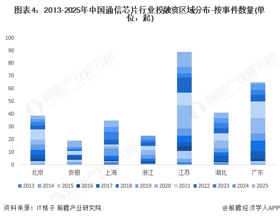 从通信芯片行业的企业融资区域来看,目前江苏省、广东省的融资数量分布最多,江苏省共89件,广东省65件,北京、上海、湖北的融资数量大于30件。