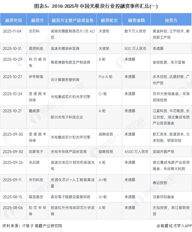 (原标题:【投资视角】启示2025:中国光模块行业投融资及兼并重组分析(附投融资事件、产业基金和兼并重组等))