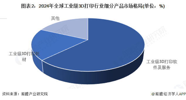 工业级3D打印根据产品及服务构成可以分为工业级3D打印设备及零部件、耗材、软件以及工业级3D打印服务四大板块。根据数据显示,2024年工业级3D打印软件及服务市场和工业级3D打印耗材市场是全球工业级3D打印行业最大的两个细分产品市场,占比分别达到63%和19%。