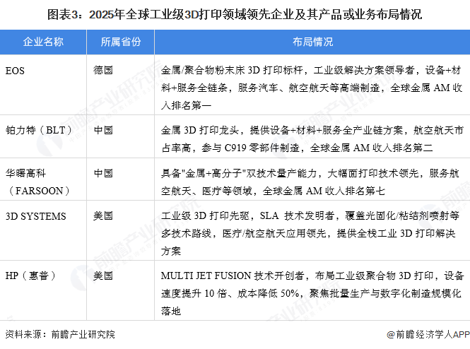 全球工业级3D打印行业呈欧美主导、中国加速追赶格局:德国EOS、美国3D Systems/Stratasys/SLM Solutions、GE Additive主导金属/高分子高端市场,聚焦航空医疗;中国铂力特、华曙高科在SLM领域崛起,份额快速提升。当前企业竞争主要聚焦在技术精度、材料适配与规模化生产,头部企业通过并购加速整合,市场集中度持续提高。企业具体布局情况如下: