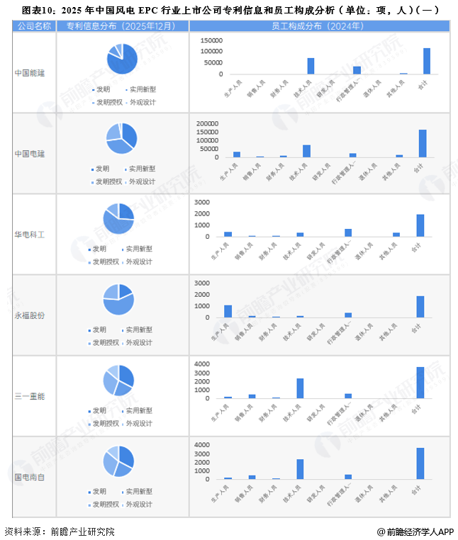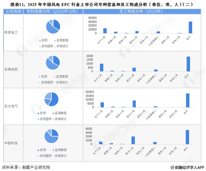 从风电EPC行业的上市企业已有的公开信息分析,专利信息相对较多的企业是明阳智能,其中发明专利459项;员工总数最多是中国电建,员工总数为16.39万人。