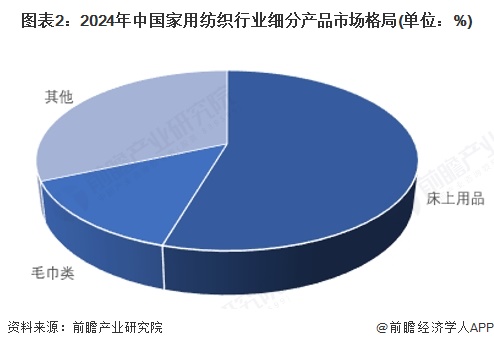 家用纺织品根据用途可以分为床上用品、毛巾类制品、布艺类制品等根据数据显示,2024年床上用品市场和毛巾类市场是中国家用纺织行业最大的两个细分产品市场,占比分别达到55%和14%。