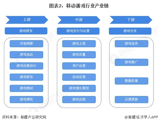 中国移动游戏的产业链上游为游戏研发,中游为游戏发行与运营,下游为游戏分发。其中,游戏研发环节包括市场洞察、游戏选品、游戏创意设计、游戏研发、游戏测试和游戏调优等步骤,游戏发行与运营则包括游戏上线、游戏买量、用户运营、活动运营、游戏增长策划、游戏出海等过程,游戏分发则是在不同平台进行推广宣传、数据收集、反馈更新的过程。