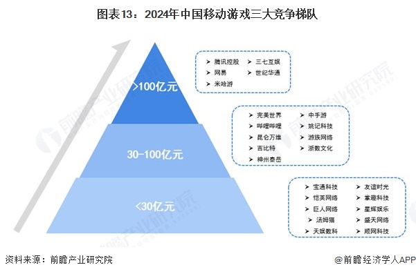 在快速发展过程中,中国移动游戏行业整体规模、品牌影响力不断攀升。移动游戏行业依据企业在2024年的营业收入划分,可分为3个竞争梯队。其中,营业收入大于100亿元的企业有腾讯控股、网易、米哈游、三七互娱、世纪华通;营业收入在30-100亿元之间的企业有完美世界、哔哩哔哩、昆仑万维、吉比特、神州泰岳等;其余企业的营业收入在30亿元以下。