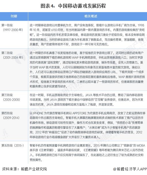 移动游戏的发展历程可以看做是手机和科技的发展历程,2010年苹果推出iPad,自此后平板游戏才正式开始发展,而平板游戏主要是手机游戏的多样化终端渠道。一款支持手机终端的移动游戏不一定支持平板终端,而支持平板终端的移动游戏一定支持手机终端。故前瞻主要以手机游戏的发展历程分析移动游戏行业的发展,主要分为以下五个阶段: