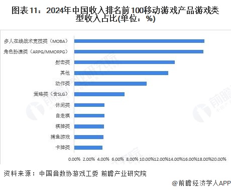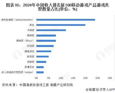 从收入上看,2024年收入排名前100的移动游戏中,多人在线战术竞技类占比17.99%,位居首位;角色扮演类次之,占比17.85%;射击类占比13.89%,位居第三;三者合计占比总收入49.73%。其中,角色扮演类占比相较去年下滑11.70%。