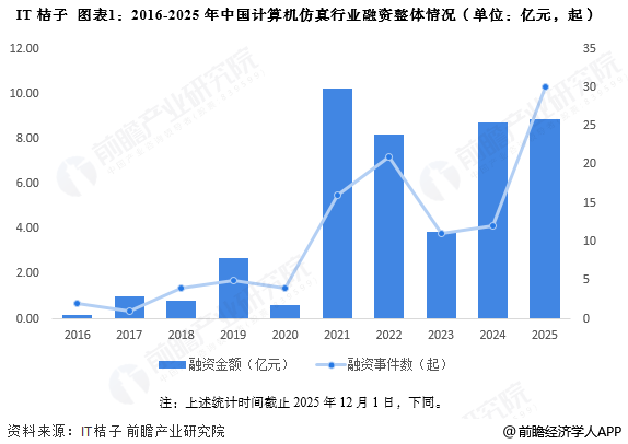 根据IT桔子,2016-2025年期间,我国计算机仿真行业共发生了108起融资事件,投融资活跃度呈波动上升态势。2024年,计算机仿真行业披露融资金额的事件共有12起,共计8.73亿元。2025年截至12月1日,计算机仿真行业投融资事件共有30起,共计约8.89亿元。