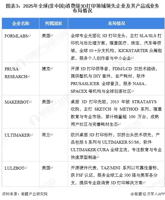 当前全球消费级3D打印行业呈中国品牌主导格局,拓竹科技、创想三维、纵维立方、智能派等中国品牌合计贡献了全球95%的份额。欧美Prusa、Ultimaker 退守高端准专业市场,竞争聚焦技术升级、生态构建。部分企业具体布局情况如下: