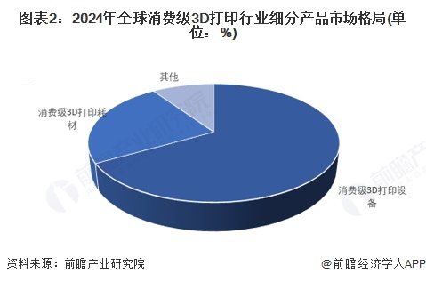 消费级3D打印根据产品及服务构成可以分为消费级3D打印设备及零部件、耗材、软件以及消费级3D打印服务四大板块。根据数据显示,2024年消费级3D打印设备市场和消费级3D打印耗材市场是全球消费级3D打印行业最大的两个细分产品市场,占比分别达到67%和24%。