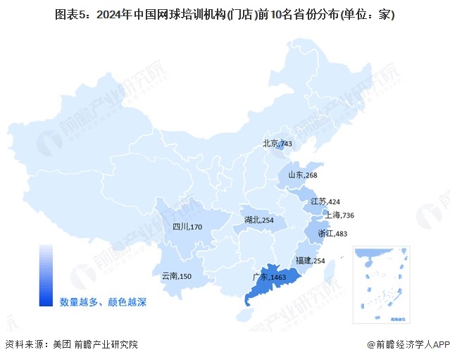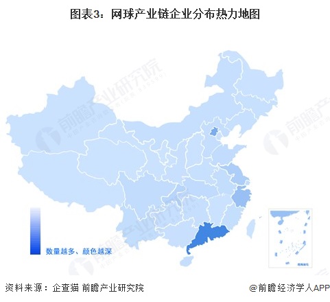 网球产业链区域热力地图:广东分布最集中