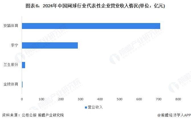 当前,中国网球行业上市公司确实数量极少,现有企业多以体育产业多元化布局为基础切入网球赛道。前瞻筛选网球行业代表性上市公司为金陵体育、兰生股份、李宁和安踏体育。其中,安踏体育作为国内体育用品巨头,其通过多品牌矩阵发力网球领域。旗下收购的威尔胜是全球知名网球装备品牌,2024年凭借Blade系列及费德勒联名球拍重夺美国专业球拍市场第一份额。2024年营业收入高达708.26亿元。