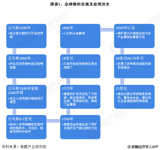 人类对锑的使用可以追溯到公元前三千多年。早在公元前3100年的埃及前王朝时代,三硫化二锑就被当作眼影粉使用。但很长一段时间里,人们并未真正认识这种金属,直到1896年人们才制出电解锑。1930年以后,锑矿鼓风炉熔炼法成为生产金属锑的重要方法。20世纪60-70年代发展了多种挥发熔炼和挥发焙烧法。截至目前,锑的主要应用领域是阻燃剂、蓄电池合金、催化剂以及玻璃澄清剂等领域。