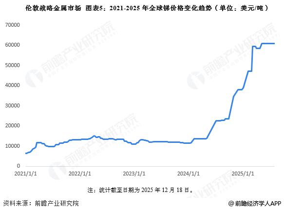 2021-2023年全球锑价保持在1.5万美元/吨左右波动,2024年之后受中国进口管制影响,海外市场锑资源供给快速下滑,导致全球锑价格快速上升,目前,全球锑价格维持在6万美元/吨左右。