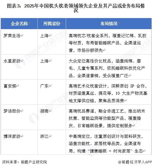 从枕头枕套市场优势竞争者竞争格局来看,罗莱、水星等头部企业靠全产业链整合与全渠道布局构建壁垒;富安娜、梦百合等通过品牌定位差异化(艺术、功能)抢占细分市场。行业分化明显,高端市场拼设计与品质,大众市场争效率与性价比,功能化、场景化、全渠道融合成为核心竞争方向,中小品牌需靠精准细分定位实现突围。企业具体布局情况如下:
