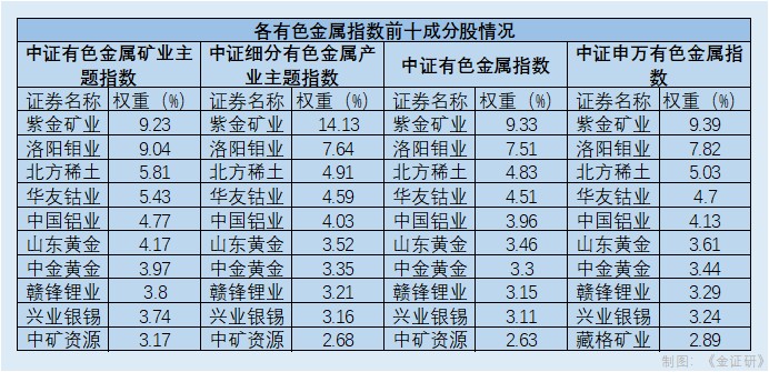 此外,在前十成分股上,四个指数的成分股基本一致,前二成份股均为紫金矿业和洛阳钼业并且权重占比较高,合计占比均超过16%。
