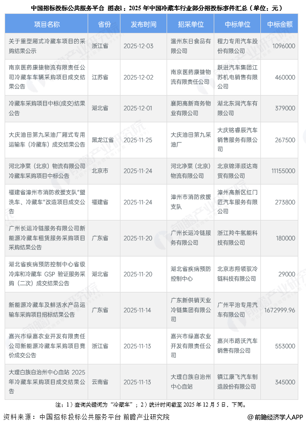 从中国冷藏车行业招投标事件来看,目前冷藏车行业招投标事件主要以产品采购为主。2025年部分招投标事件汇总如下:
