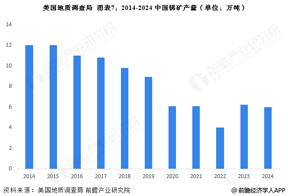 随着锑矿战略地位的不断上升,环保意识的不断加强,以及锑矿收储政策的落地,我国锑矿供给量连续十年下降,2014-2024年,我国锑矿产量从12万吨下降至6万吨,下降幅度达到50%。