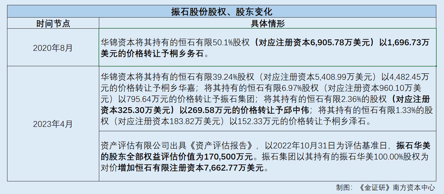 2020年8月18日,恒石有限召开股东会并作出决议,因桐乡务石以其持有振石股份50.1%股权(对应注册资本6,905.78万美元)作为出资设立桐乡华嘉企业管理有限公司(以下简称“桐乡华嘉”),同意恒石有限股东由桐乡务石变更为桐乡华嘉。同日,华锦资本与桐乡华嘉签署《合资协议》。2020年8月20日股权变更完成后,振石股份股权结构变更为桐乡华嘉、华锦资本分别持股50.1%、49.9%。