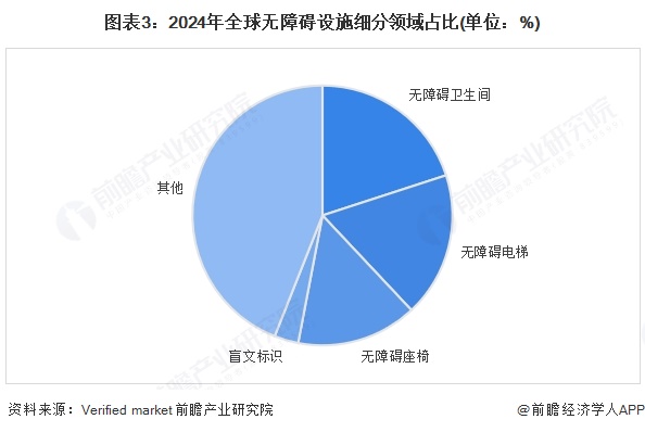 无论是在家庭里还是康复中心,从细分领域来看,全球无障碍卫生间占据细分市场最大份额,达20%,其次是无障碍电梯,占比18%,以及无障碍座椅,占比15%。盲文标识增速最快,反映出人们对公共空间包容性的需求日益增长。