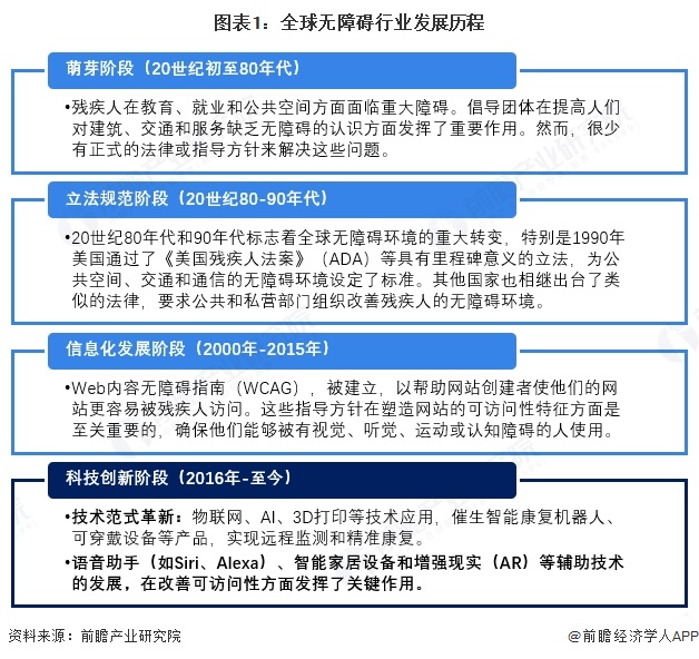全球无障碍产业的发展历程是技术迭代与市场需求深度结合的典范,其演进轨迹可划分为萌芽阶段、立法规范阶段、信息化发展阶段和技术创新发展阶段等四个阶段,每个阶段与医疗技术进步、人口结构变化及政策推动密切相关。在20世纪80年代之前,残疾人在教育、就业和公共空间方面面临重大障碍。人们也日益认识到需要辅助技术,如屏幕阅读器、助听器和替代输入设备,以支持各种残疾人士。随着互联网开始发展,这导致了20世纪90年代末第一个可访问网站的发展。2000年,移动设备的普及和智能手机的推出也刺激了移动应用程序和操作系统中无障碍功能的发展。例如,苹果是最早在iOS中加入各种无障碍选项的公司之一,比如为视障人士提供的Voice Over。谷歌随后在Android上推出了类似的辅助功能。这些技术改变了残疾人与数字世界互动的方式。2015年后随着可访问性的不断发展,通用设计的概念出现了。通用设计的重点是创造所有人都能使用的产品、服务和环境,无论他们的能力或残疾如何。它超越了遵守残疾人特定的指导方针,旨在提高产品对每个人的整体可用性。