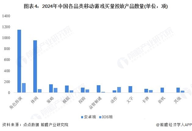 从2024年中国各品类移动游戏买量投放产品数量来看,角色扮演类游戏依然延续着一贯的强势表现,大幅领跑买量榜。其安卓端买量投放产品数量为1147项,IOS端为178项。这其中主要的游戏产品,除了《梦幻西游》、《崩坏:星穹铁道》、《梦幻新诛仙》等主流RPG外,还有大量的传奇类游戏,且多以高爆率、送VIP、免费畅玩、传承经典为主要宣传点。而由于中国安卓手机保有量高、安卓渠道更为多样丰富、安卓手机可以直接下载安装第三方应用等特点,大部分品类下的投放产品数量都是安卓端大于iOS端,唯有动作类游戏数据表现例外,也说明苹果手机用户更偏爱动作游戏。