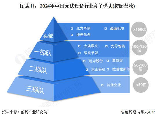 根据2024年企业营收规模划分,北方华创、捷佳伟创、晶盛机电营收超过150亿元,处于行业第一梯队;大族激光、双良节能、先导智能营收在100-150亿元之间,处于行业第二梯队;迈为股份、奥特维、京山轻机、拉普拉斯等营收在50-100亿元之间,处于行业第三梯队。