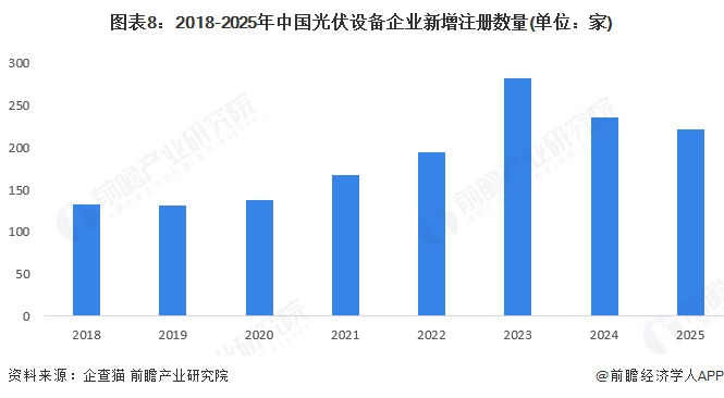 2018年以来,中国光伏设备企业注册数量先增后降,2023年注册数量达到282家,较2022年增长44.62%。2024年光伏设备企业注册数量为236家,同比下降16.31%。2025年截至12月8日,企业注册数量达到221家。