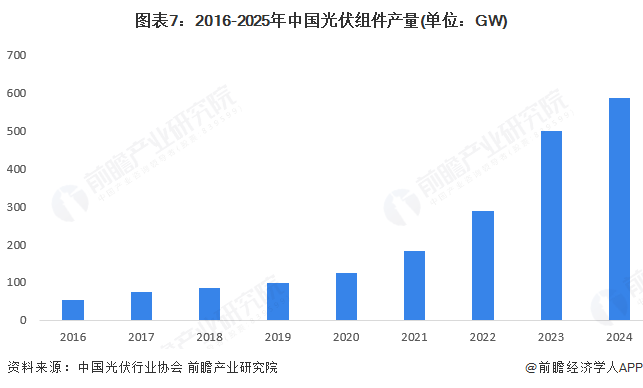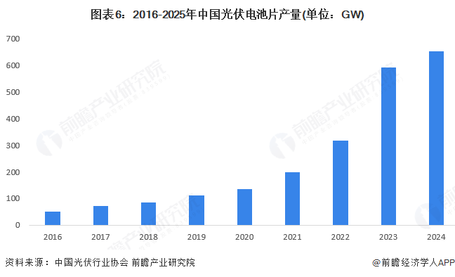 近年来,中国光伏行业在政策和需求的推动下迅速发展。2016年以来,中国光伏电池片产量持续攀升,2024年光伏电池片产量达到654GW,同比增长10.7%。