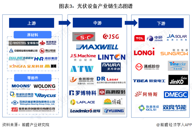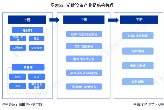 中国光伏设备处理行业产业链上游为钢材、铝材、金刚线等原材料,轴承、电机、激光发生器等零部件供应商;中游为光伏设备研发制造企业;下游为光伏制造企业。