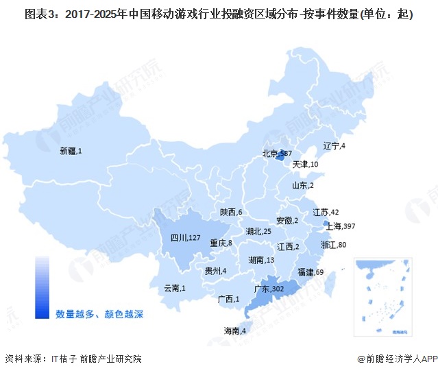 从融资区域分布来看,2017-2025年,我国移动游戏行业融资事件主要分布在华东和华南地区,其中北京市融资事件数量达587起,居全国第一;上海市、广东省融资事件数量分别为397起、302起,排名第二、三。