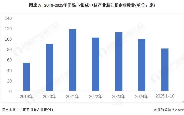 根据企查猫查询数据,截至2025年11月,无锡市集成电路企业共有735家。2019-2024年,无锡集成电路产业新增注册企业数量整体呈现上升趋势,2024年新注册企业100家。2025年1-10月,无锡集成电路产业新增注册企业数量82家。