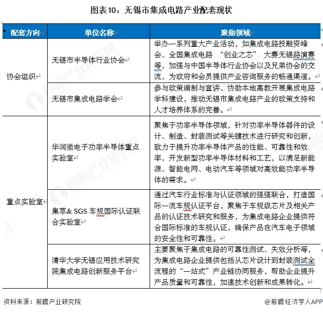无锡市大力推进集成电路产业发展,在协会组织、重点实验室配套发展等方面给予了重要的产业支撑。协会组织主要有无锡市半导体行业协会、无锡市集成电路学会;重点实验室主要有华润微电子功率半导体重点实验室、集萃& SGS车规国际认证联合实验室、清华大学无锡应用技术研究院集成电路创新服务平台等。