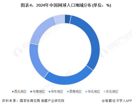 从我国各省份网球人口地域分布来看,2024年中国网球人口主要分布在中南地区,占比32%。其次是华东地区和西南地区。